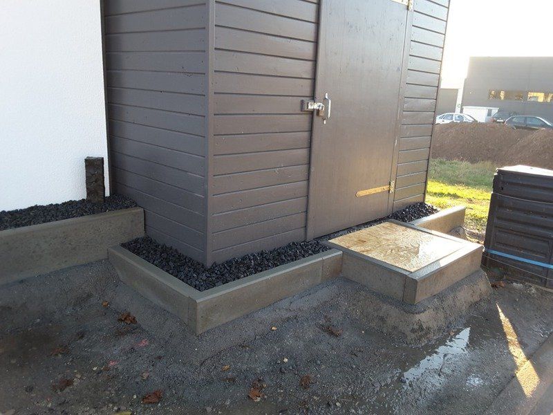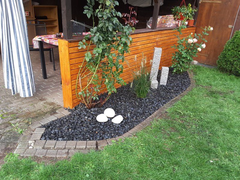 Erstellung eines Steingartenbeetes als Spritzschutz an einer Garage und eines Schuppens in Rottenburg