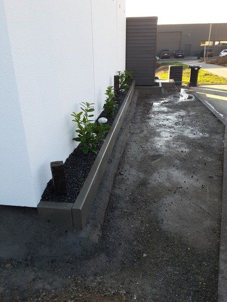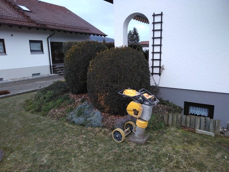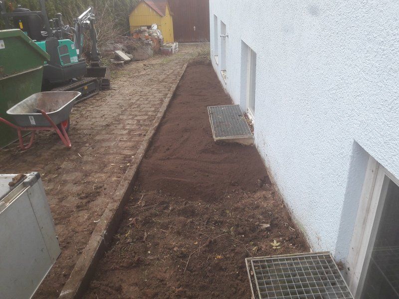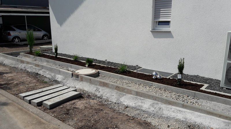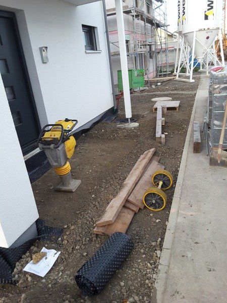 Erstellung eines Traufstreifens (Spritzschutz) aus Tiefborden und Basaltschotter, eines angrenzenden Pflanzbeetes und eines Podestes am Hauseingang in Rottenburg