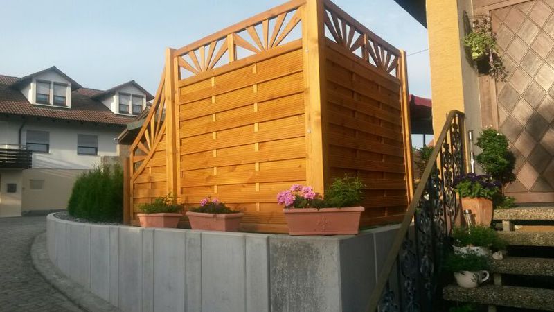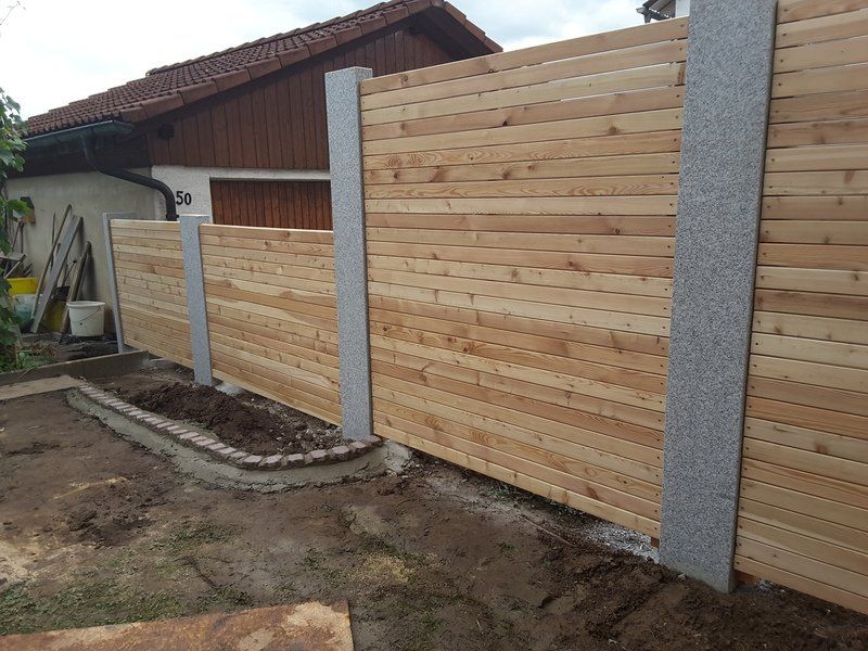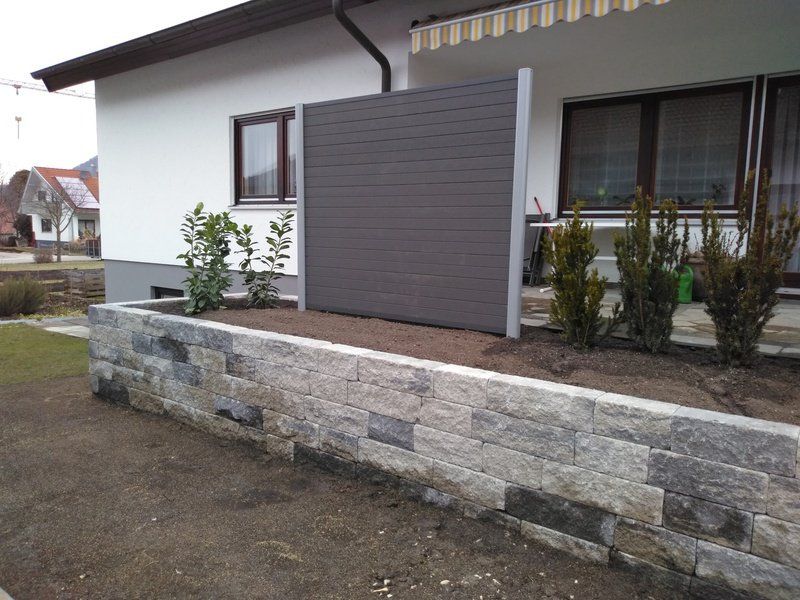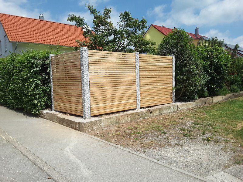 Erstellung einer Sichtschutzwand aus sibierischem Lärchenholz und Granitpalisaden, WPC-Terrasse mit Umrandung aus Granitpalisaden in Rottenburg