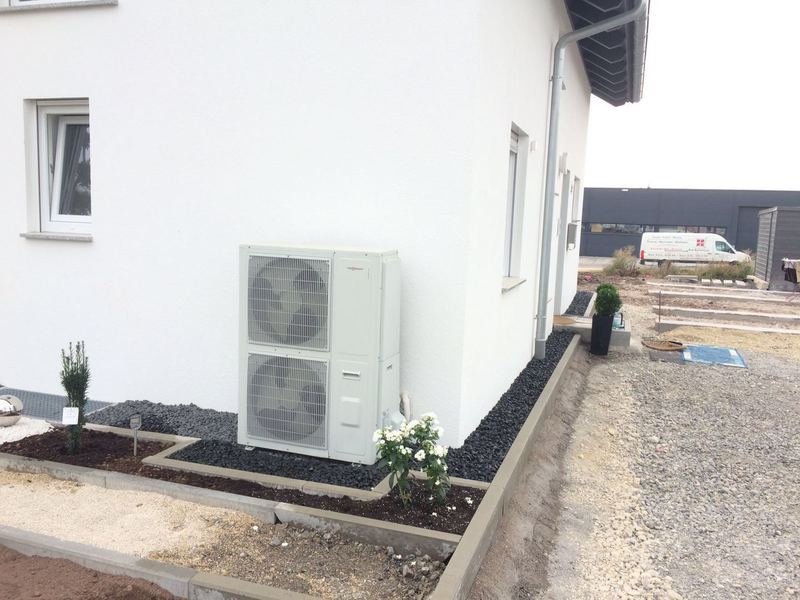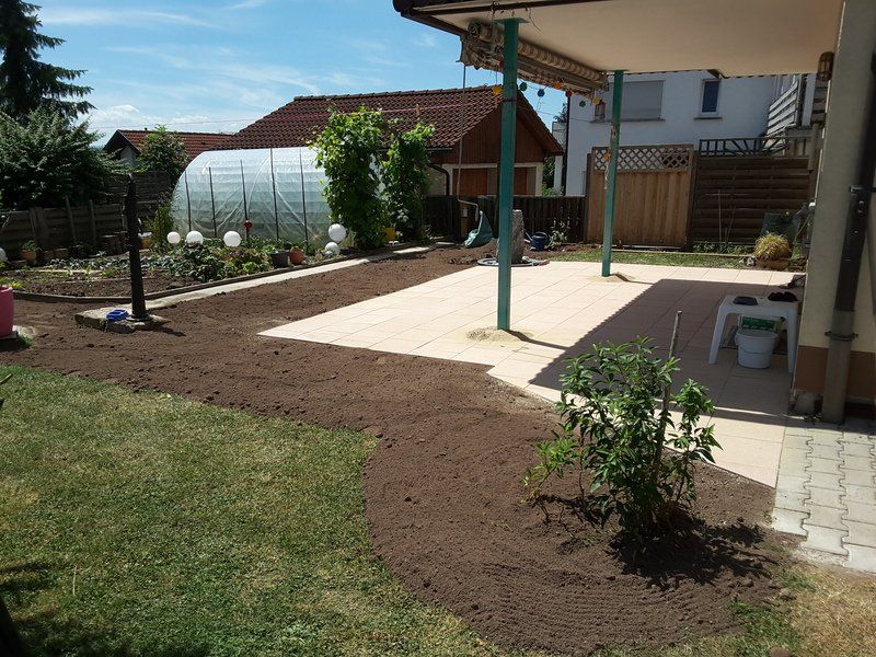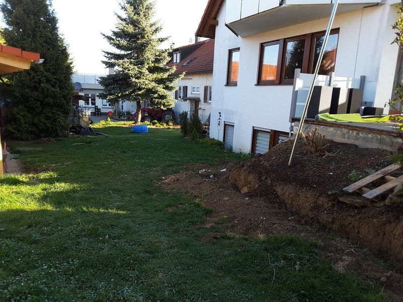 Komplette Gartenneugestaltung in Ofteringen mit Terrasse aus modernen Betonplatten, Stützmauer, Weg ums Haus und Rollrasen