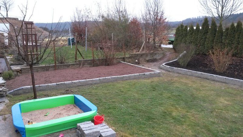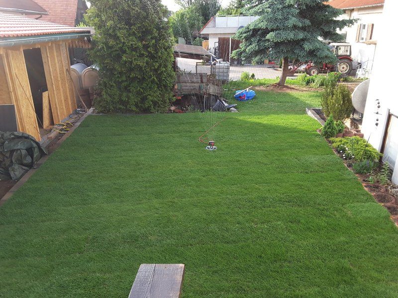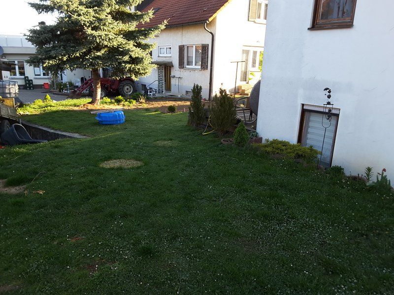 Gartenumgestaltung in Rottenburg: Aufteilung in zwei Ebenen mit barrierefreiem Zugang zum unteren Gartenteil (Rampe), Erstellung von Stützmauern und Vorbereitung und Verlegung von Rollrasen