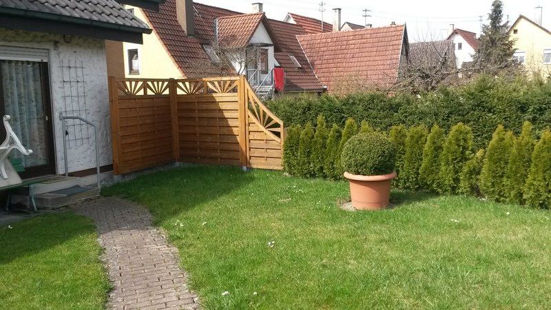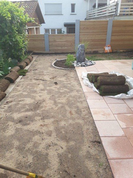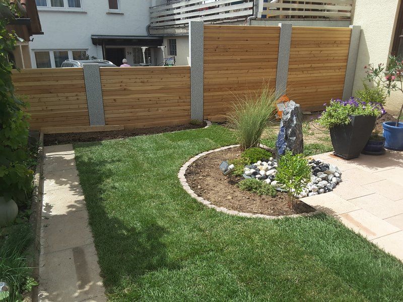 Neuverlegung einer Terrasse, Neugestaltung einer Sichtschutzwand aus Granitpalisaden und sibierischem Lärchenholz sowie Vorbereitung und Verlegung von Rollrasen in Rottenburg
