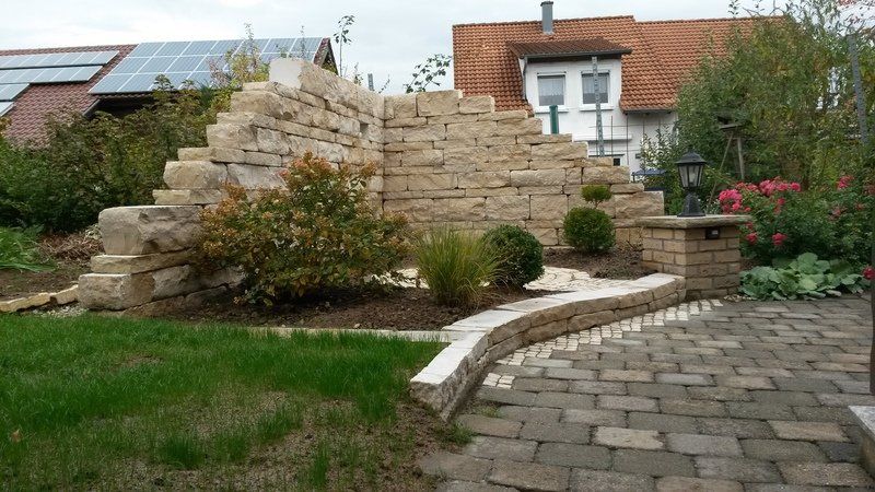 Hier entstanden eine Natursteinmauer (portugiesischer Kalkstein), eine Beetbegrenzung, eine kleine Sitzecke aus Natursteinpflaster, eine Neupflanzung und eine Rasenansaat in Metzingen